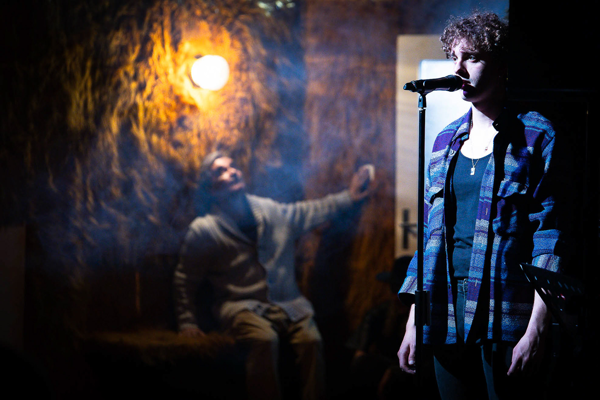 Matouš Benda jako Kubo, v pozadí Jan Kolařík (Dežo), v inscenaci Nie sme doma, režie Anna Davidová, Divadlo Husa na provázku, uvedení na festivalu Setkání / Stretnutie, 2025.