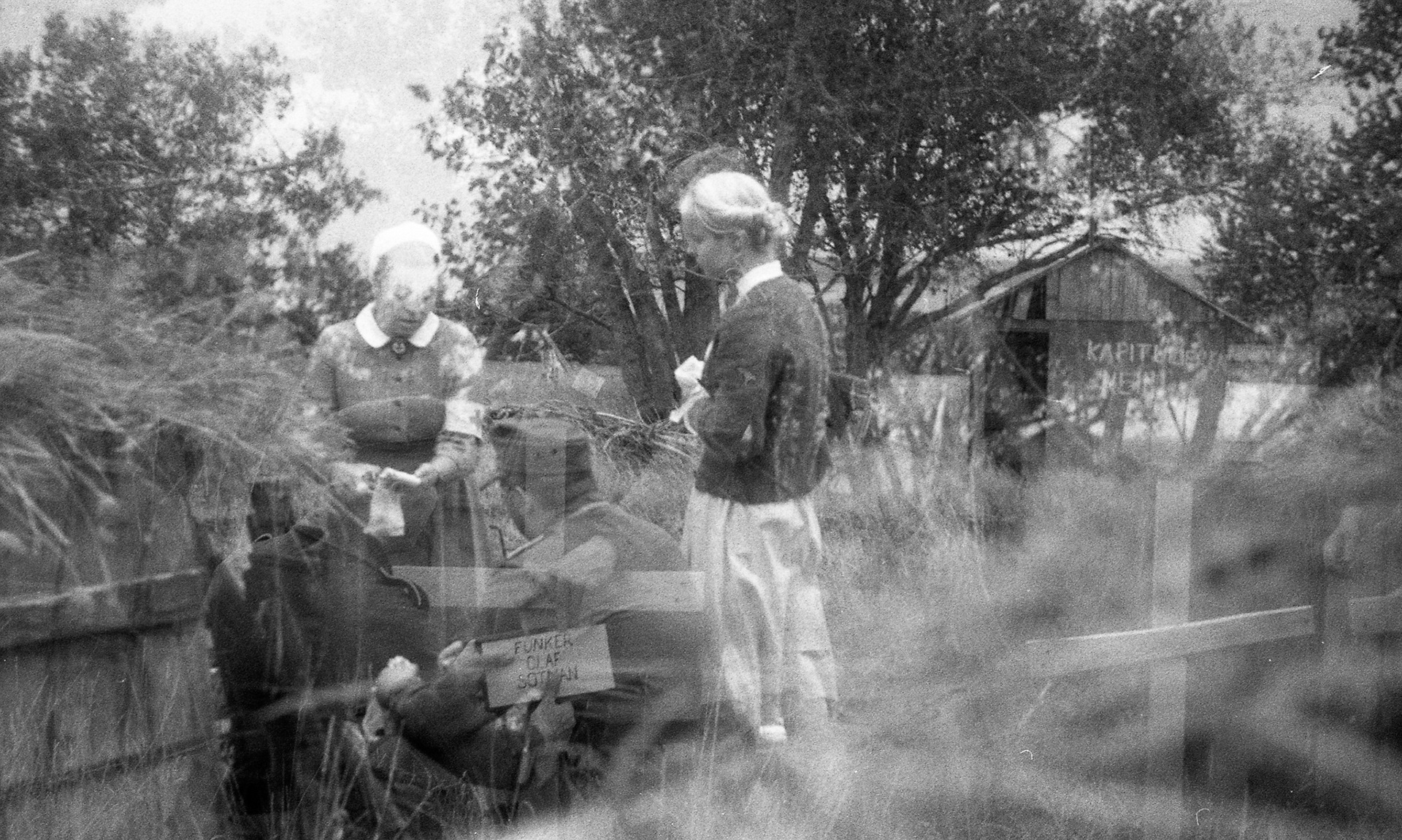 Příslušnice DRK (Deutsches Rotes Kreuz) pomáhají připravovat provizorní hroby v blízkosti polního lazaretu. Dvojitá expozice focená na historický fotoaparát Kodak Retina 118. Vojenská rekonstrukce v Ořechově u Brna, 2023.