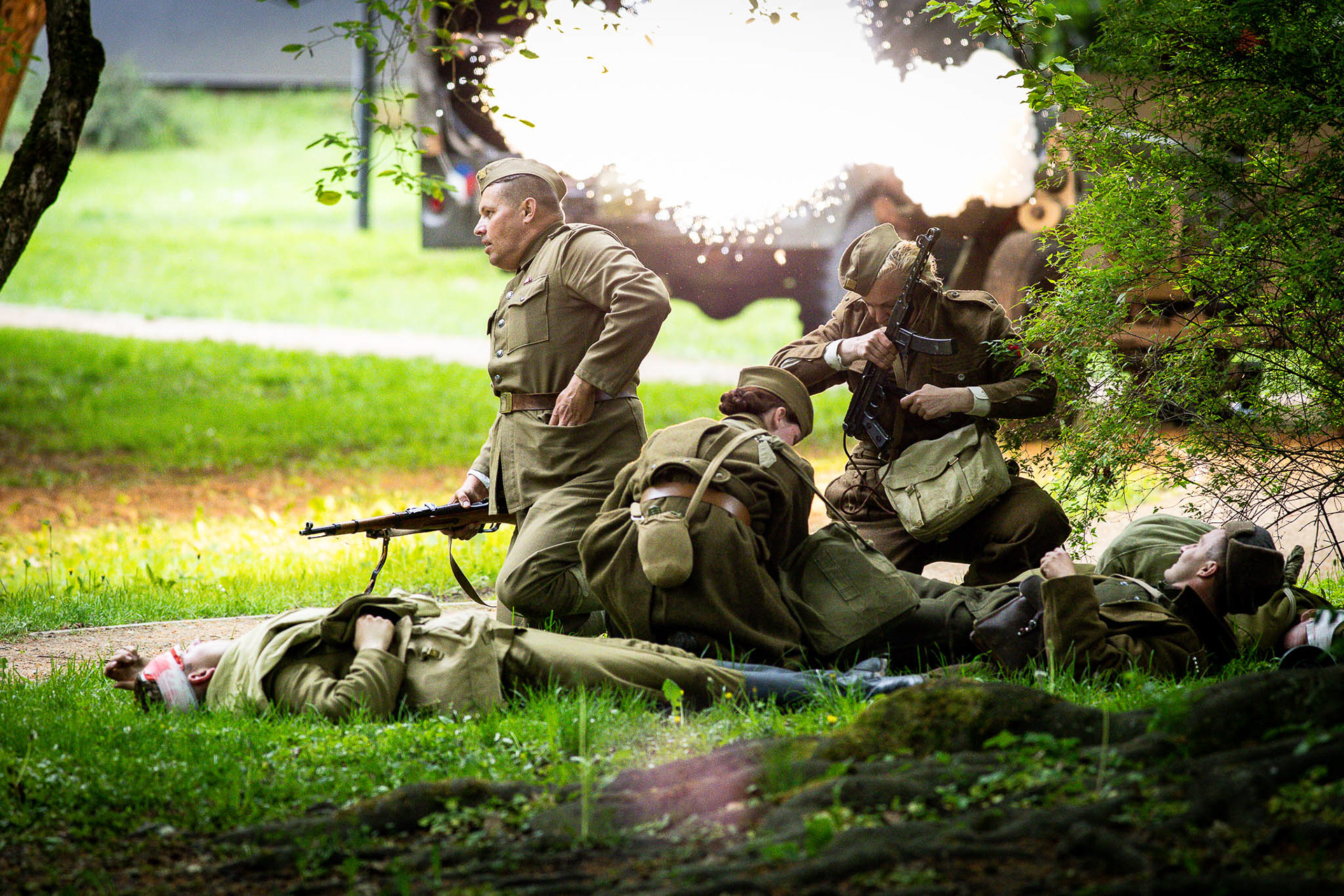 Rekonstrukce osvobozování města Vsetín v květnu roku 1945. Příslušníci 4. brigády 1. československého armádního sboru v SSSR ošetřují raněné, krytí palbou proti německým jednotkám. Akce k 80. výročí osvobození města.